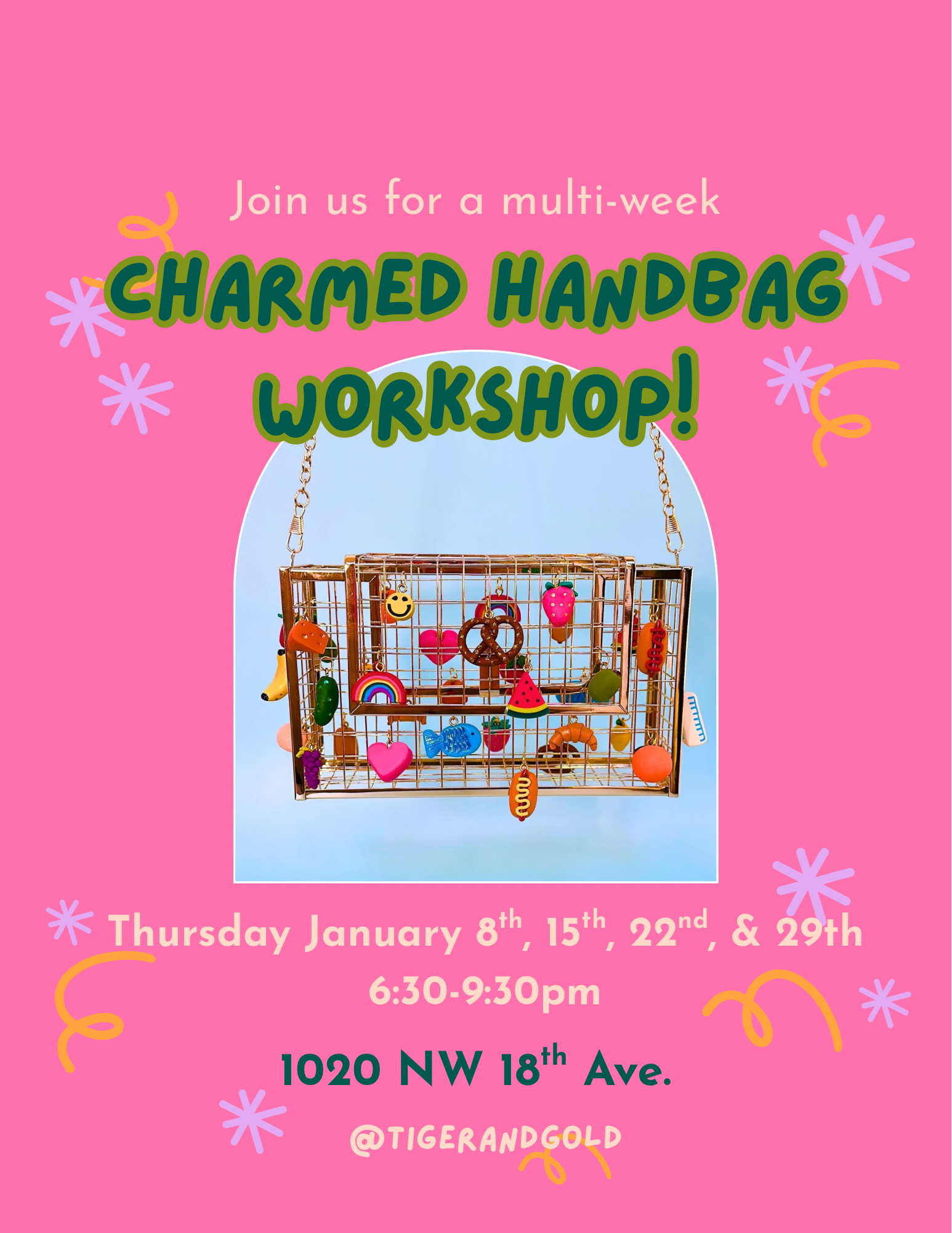 Join us for this handmade polymer clay charmed handbag making workshop! In this class you'll learn to condition polymer clay, decorate using a variety of methods, and finish your work cleanly. You'll walk away with a handbag that can be used as a clutch or with an included strap fully decorated with charms handmade by you. You will make 30-40 charms over four consecutive weeks and learn how to use them to decorate your bag. This is a lighthearted class perfect for beginners or more advanced crafters looking to have fun. We'll have light snacks and drinks plus you'll get a chance to be creative and build community! Ages 16+ only.